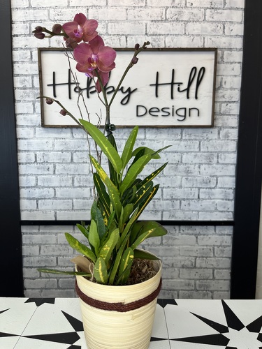 A beautiful orchid pairs perfectly with this lush green plant in an organic bamboo pot.
